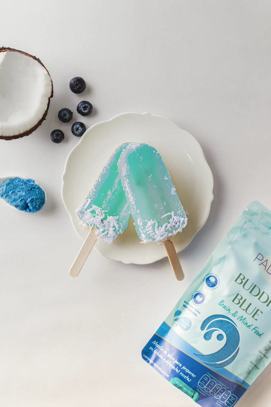 Mix your Buddhi Blue with coconut water, pour into popsicle molds, and top with something fun, we used shredded coconut! 🥥✨