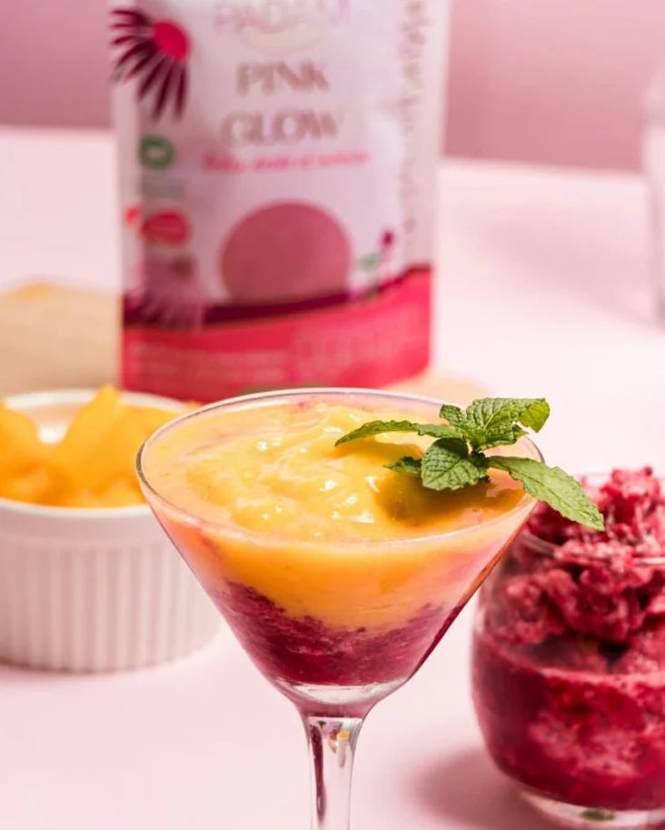 Blend the berries with 1 tsp of Pink Glow and some ice until you get a slushy, sorbet-like texture 🥶🍧